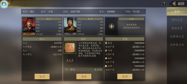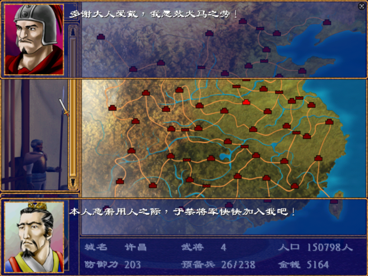 这游戏还要注意一点,别把城内铜钱消耗光,每个武将都有俸禄,铜钱不够发俸禄武将会掉忠诚度,忠诚度到0再发不起工资武将也会跑路。好在这种属于极端情况,正常大城池里铜钱产量每天多到爆仓,想用光都难。只要别把很多高俸禄大将同时放到一个小城里就没问题。