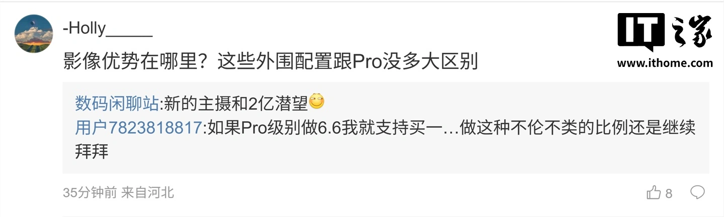 后续有用户在评论区询问:“影像优势在哪里?这些外围配置跟 Pro 没多大区别”,博主回复道:“新的主摄和 2 亿潜望”;另一名用户则询表示:“屏幕可以再大点,比如弄到 6.9 寸”,博主回复道:“6.71 保手感不喜欢吗”。