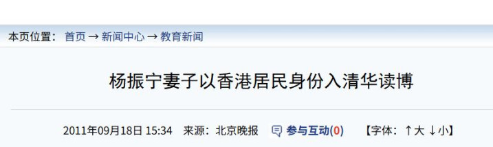 《杨振宁妻子以香港居民身份入清华读博》(中新网)